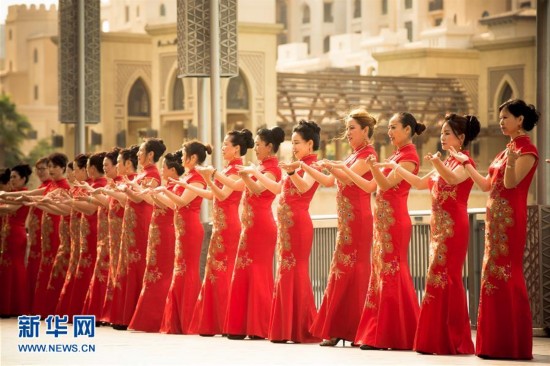 1月15日,身著旗袍的快閃活動(dòng)參與者在阿聯(lián)酋迪拜表演。新華社發(fā)(張澍民攝)