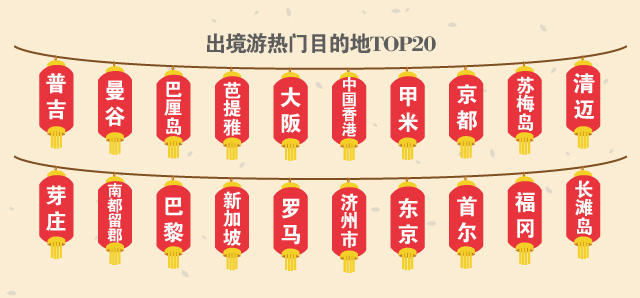 排名前20位的出境游目的地城市分別為普吉、曼谷、巴厘島、芭提雅、大阪、中國香港、甲米、京都、蘇梅島、清邁、芽莊、南都留郡、巴黎、新加坡市、羅馬、濟(jì)州市、東京、首爾、福岡、長灘島。