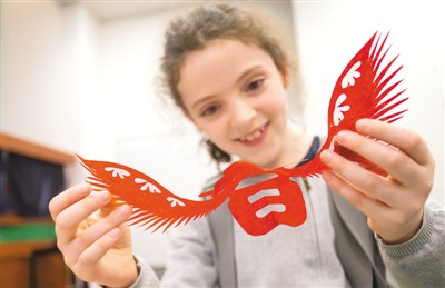 1月19日,一名女孩在加拿大多倫多公共圖書館春節(jié)活動現(xiàn)場欣賞剪紙作品。