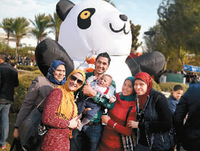 1月20日,在埃及首都開羅,人們在春節(jié)大廟會上合影留念。
