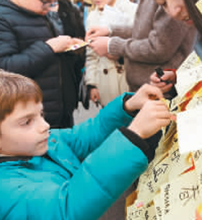 2016年1月30日,在意大利羅馬中國文化廟會上,一名意大利男孩將自己用中文寫的“春”字貼在展板上。