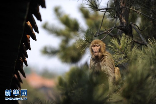 3月16日,一只獼猴在河北省承德市雙塔山景區(qū)的樹枝上停留。