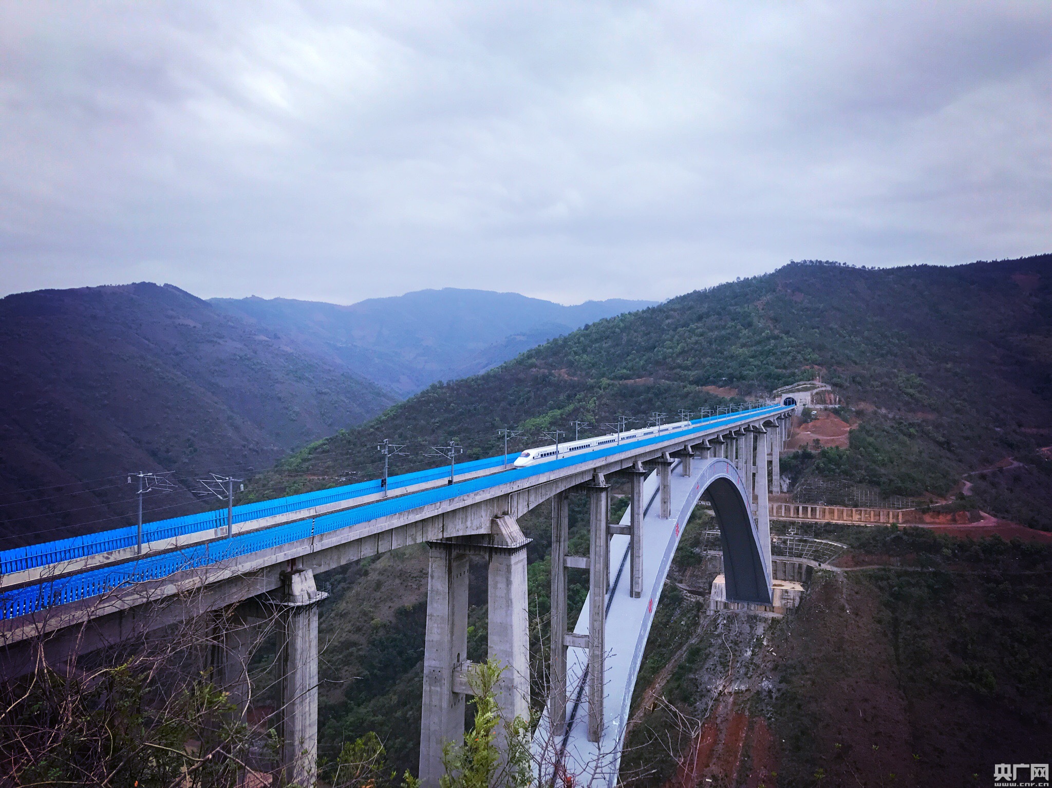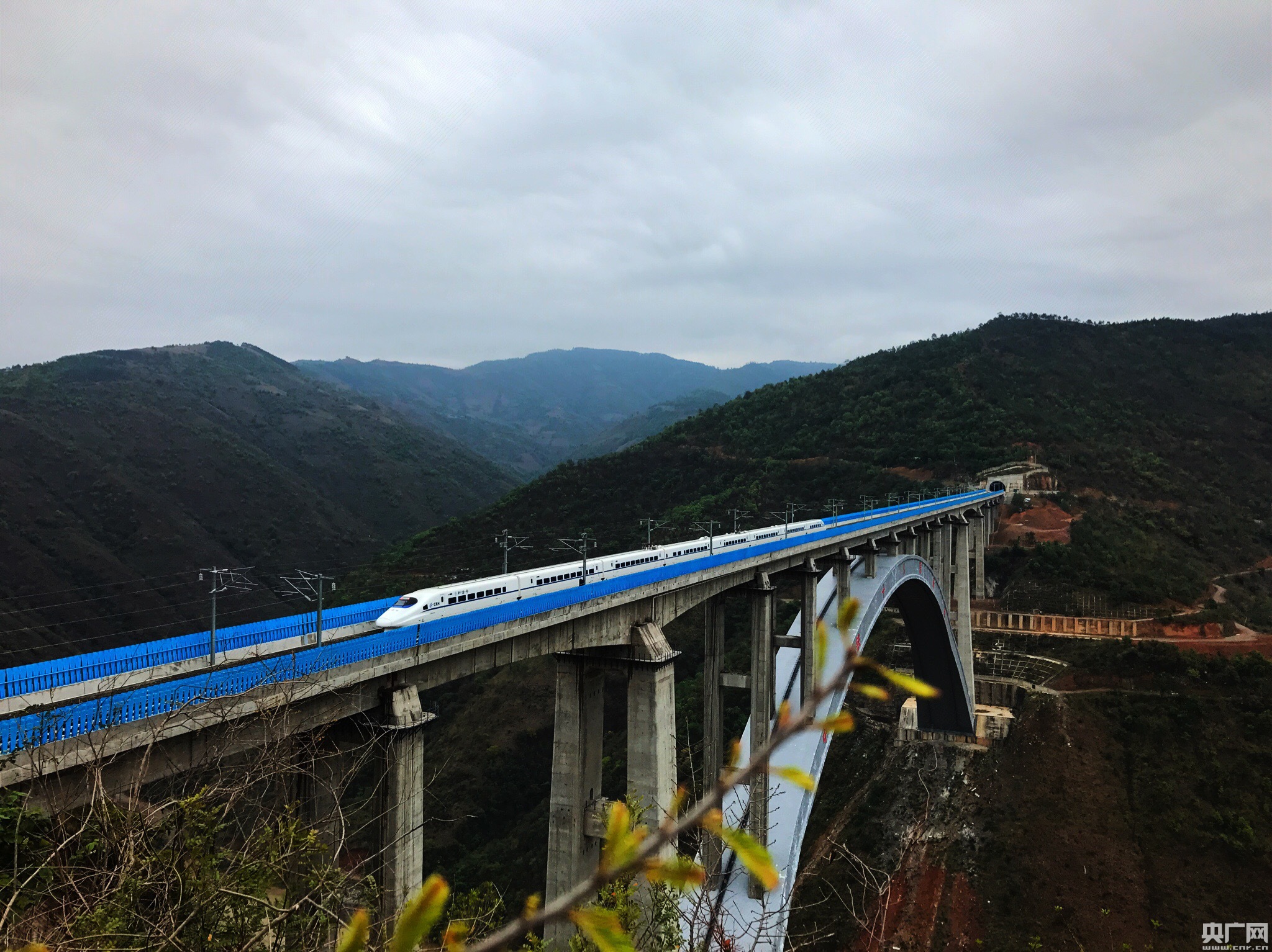 2017年4月23日,紅河,動車組列車在云桂鐵路南盤江特大橋上飛馳。 -