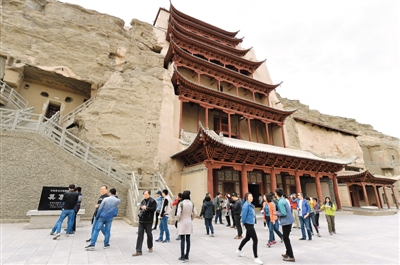 自2016年首屆絲綢之路(敦煌)國際文化博覽會在甘肅敦煌成功舉辦以來,敦煌受到越來越多的關注。敦煌借此機遇,推出多項旅游優(yōu)惠政策。據統(tǒng)計,僅今年第一季度,敦煌市旅游接待量就達113萬人次,總收入達11億元,分別增長20%和21.5%。上圖為游客在敦煌莫高窟參觀九層樓。
