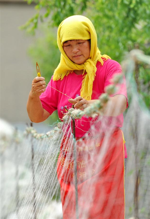 7月10日,黃驊市南排河鎮(zhèn)后范家堡村漁民在修補(bǔ)漁網(wǎng)。時(shí)下正值黃渤海休漁期,河北省黃驊市漁民充分利用“假期”修船、補(bǔ)網(wǎng),確保開漁后安全生產(chǎn)。 新華社記者楊世堯攝