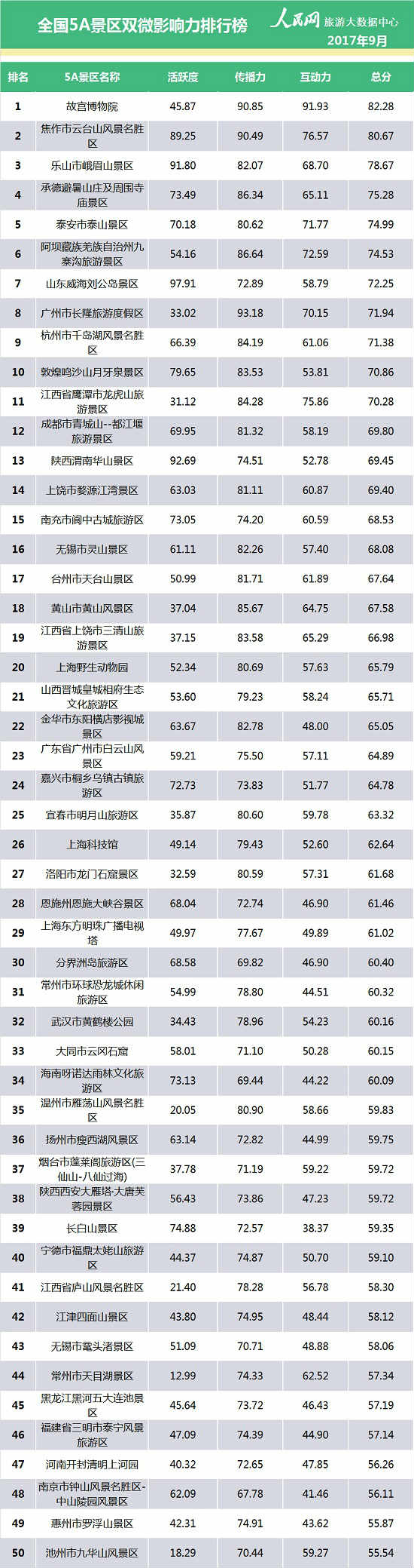 人民網(wǎng)輿情監(jiān)測室發(fā)布2017年9月全國5A景區(qū)雙微影響力排行榜,榜單以全國范圍內(nèi)的5A景區(qū)官方認(rèn)證微博、微信為評(píng)價(jià)對(duì)象,綜合考察活躍度、傳播力和互動(dòng)力三個(gè)指標(biāo),通過海量數(shù)據(jù)分析和復(fù)雜的數(shù)理模型計(jì)算,全面、立體、準(zhǔn)確地反映旅游系統(tǒng)新媒體的發(fā)展?fàn)顩r。