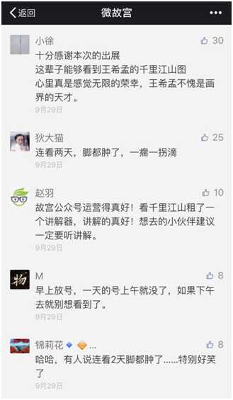 9月北京故宮博物館的展覽活動(dòng)進(jìn)入活躍期,以更加豐富多元的形式向社會(huì)公眾傳遞故宮文化信息。景區(qū)雙微對(duì)此進(jìn)行大力宣傳推廣,輿論熱情高漲:官方微信公眾號(hào)“微故宮”發(fā)布《金秋九月,來故宮看七大展覽》一文,獲得10萬+閱讀量和大量留言,網(wǎng)友紛紛為展覽活動(dòng)點(diǎn)贊;《千里江山——?dú)v代青綠山水畫特展》一文,引發(fā)繼2015年石渠寶笈特展展出《清明上河圖》后新一輪“故宮跑”。與此同時(shí),“千里江山”文創(chuàng)產(chǎn)品登上故宮微店,市場反饋良好,首飾、桌墊等產(chǎn)品融入游客生活圈,故宮品牌效應(yīng)凸顯。從雙微留言板可以看出,故宮博物院已擁有自己的粉絲群體,粉絲素質(zhì)整體較高,中國文學(xué)愛好者居多,對(duì)文化欣賞有更高的要求。據(jù)悉,2013年故宮曾展出過《千里江山圖》,社會(huì)影響甚微,而此次關(guān)注《千里江山圖》展覽的人數(shù)明顯增多,也側(cè)面說明中國民眾的整體文化水平和精神追求都有所提升。