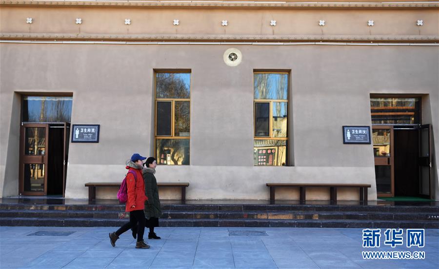 12月3日,游客從敦煌鳴沙山月牙泉景區(qū)內(nèi)一處衛(wèi)生間前走過。新華社記者 陳斌 攝 -
