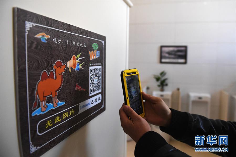 12月3日,游客在敦煌鳴沙山月牙泉景區(qū)衛(wèi)生間里用手機掃二維碼上網(wǎng)。新華社記者 陳斌 攝
