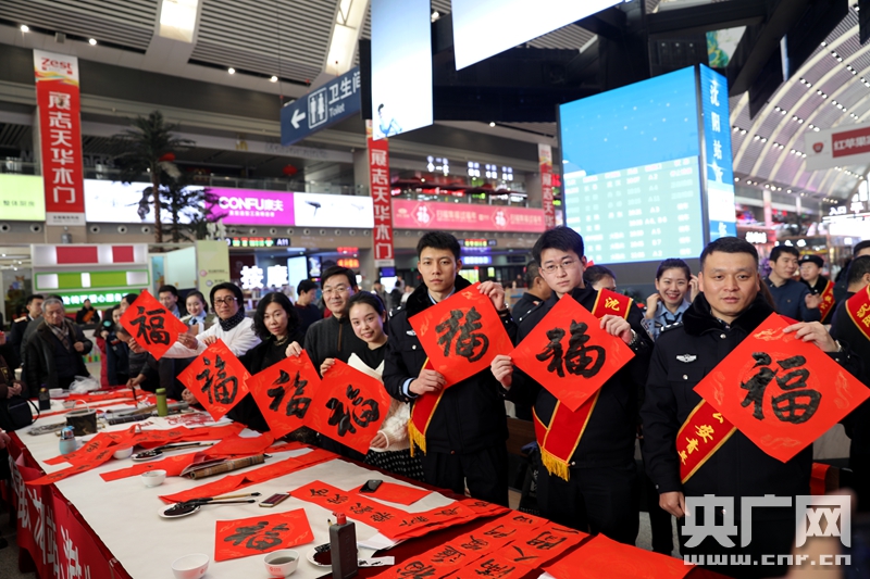 2018年2月1日春運(yùn)首日,中國(guó)鐵路沈陽(yáng)局集團(tuán)有限公司在沈陽(yáng)站開(kāi)展“鐵路春運(yùn)送萬(wàn)!被顒(dòng),為候車(chē)旅客現(xiàn)場(chǎng)送福字。