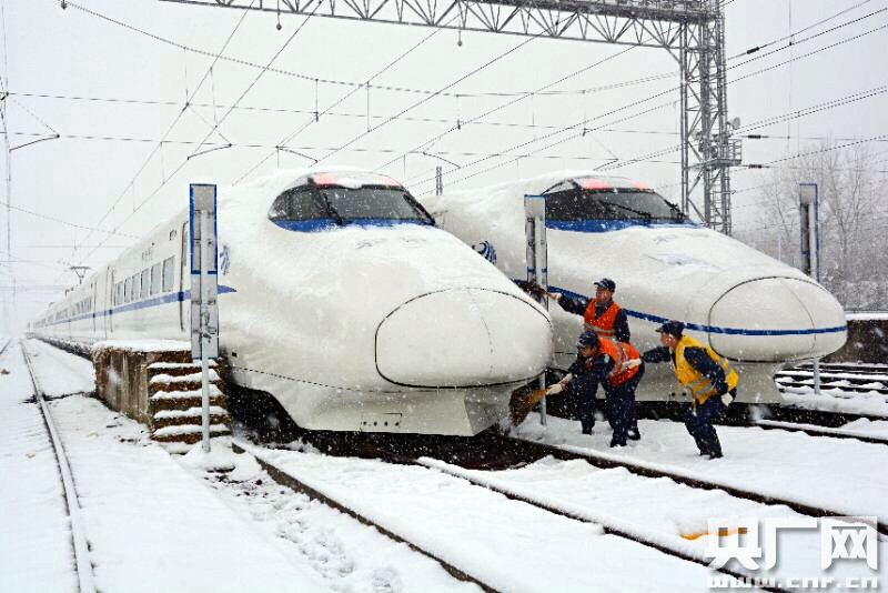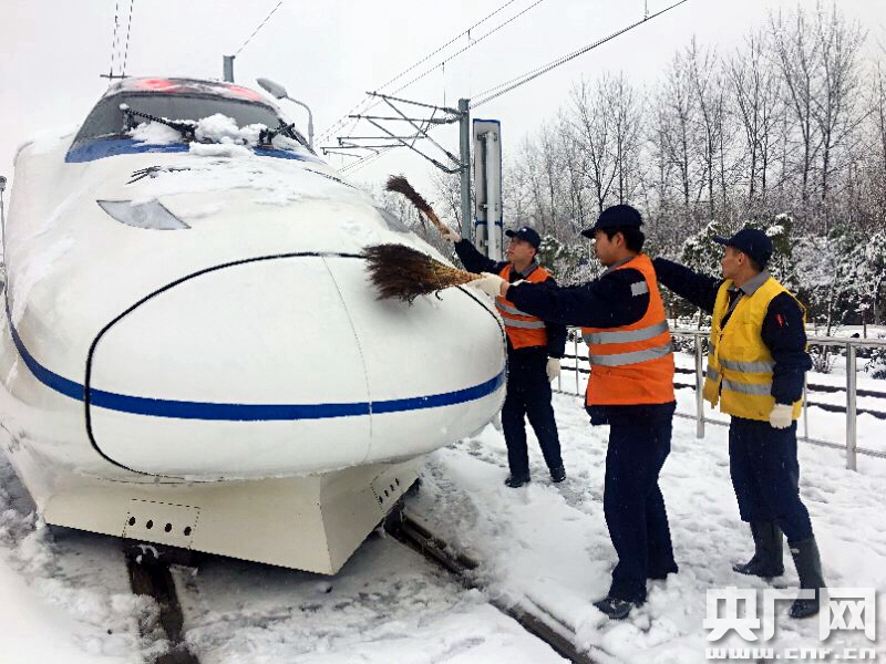 2018年1月4日,合肥南動車運(yùn)用所內(nèi),職工正在為即將上線運(yùn)行的動車組進(jìn)行掃雪除冰。(央廣網(wǎng)發(fā) 謝冰飛攝) 央廣網(wǎng)北京1月5日消息(記者何微)4日,由于大范圍、高強(qiáng)度的降雪,不少地區(qū)的鐵路運(yùn)輸受到不同程度影響。多地列車出現(xiàn)延誤和停運(yùn)情況,京廣、鄭徐、鄭西、西成等部分線路采取限速運(yùn)行措施。影響范圍覆蓋湖北、河南、安徽、江蘇、陜西、四川等地。有計劃乘火車去往或途經(jīng)上述地區(qū)的乘客請密切注意鐵路部門的信息公告。鐵路部門已經(jīng)啟動應(yīng)急預(yù)案,組織數(shù)萬名鐵路干部職工掃冰除雪,努力確保旅客出行安全暢通。 -