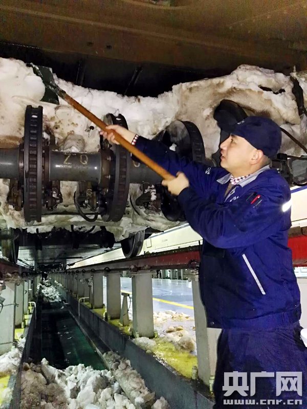 2018年1月4日 中國鐵路北京局集團(tuán)公司北京動車段,職工正在進(jìn)行動車組列車底部的掃雪除冰作用。(央廣網(wǎng)發(fā) 高悅攝) -