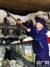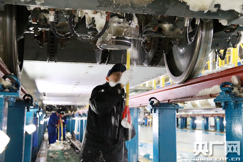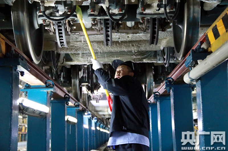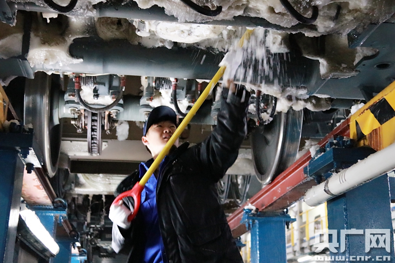 2018年1月4日 中國鐵路北京局集團(tuán)公司北京動車段,職工正在進(jìn)行動車組列車底部的掃雪除冰作用。(央廣網(wǎng)發(fā) 高悅攝)