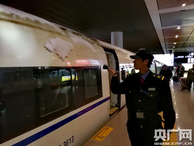 2018年1月4日,中國鐵路上海局集團(tuán)公司南京動車段隨車機(jī)械師對動車組列車加強(qiáng)站臺檢查,確保雨雪天氣中動車組安全運(yùn)行。(央廣網(wǎng)發(fā) 謝冰飛攝) -