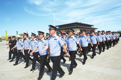 9月2日下午,酒泉市舉行了全市公安機(jī)關(guān)安保誓師大會(huì)。圖為公安干警邁著整齊的步伐走過敦煌國(guó)際會(huì)展中心廣場(chǎng)。通訊員鄒凱強(qiáng)