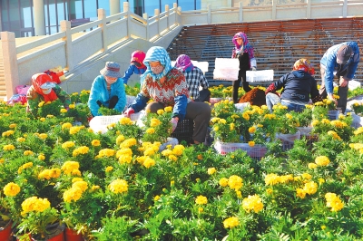 工作人員在敦煌國(guó)際會(huì)展中心外圍擺放花卉,營(yíng)造美麗環(huán)境。