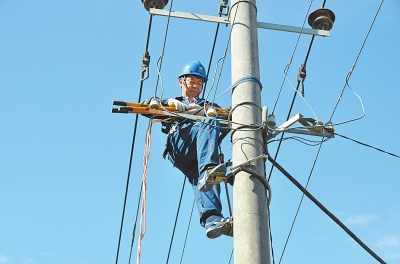 為做好第二屆敦煌文博會(huì)期間的電力保障,國(guó)網(wǎng)甘肅電力公司和嘉峪關(guān)、酒泉供電公司及酒泉7縣市區(qū)骨干力量,深入開展護(hù)網(wǎng)專項(xiàng)行動(dòng)。圖為9月6日,敦煌市月牙泉鎮(zhèn)合水村,國(guó)網(wǎng)肅北供電公司的檢修員寧生海正在十幾米高的電線桿頂部掛接地線。通訊員楊夏茹