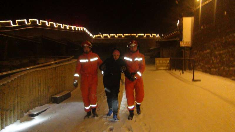 據(jù)延慶消防支隊官兵介紹,因今日下大雪,長城上到處都是積雪和薄冰,且在登城途中多處是狹窄路段,一側(cè)是懸崖峭壁,一側(cè)是叢林深淵,稍不小心就可能滑到兩邊的壕溝里,同時因在山區(qū),手機信號出現(xiàn)時斷時續(xù),更是加大了救援的難度。搜救過程異常艱難和危險,消防官兵經(jīng)過約1個小時的艱難攀爬,終于尋找到了被困人員。