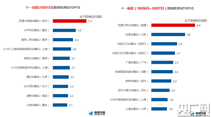 此外,在10月1日出程期間,全國全天最堵的收費站將為蘇州蘇通大橋南收費站,10月6日至7日返程車流較為分散,全國收費站周邊擁堵程度將普遍低于10月1日。其中,最擁堵的收費站為南通的蘇通大橋北收費站。