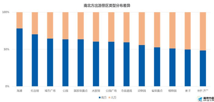 此外,從南北方景區(qū)出游類型分布差異上看,十一黃金周期間預計南方的出游用戶比例將高于北方,其中受溫度影響,海灘游南方將明顯高于北方,而在世界遺產(chǎn)、教堂類景區(qū)的出游占比上,北方則偏高于南方。