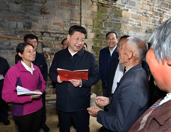 4月24日下午,習(xí)近平在六安市金寨縣花石鄉(xiāng)大灣村村民汪能保家中察看扶貧手冊(cè)。新華社記者 李濤 攝