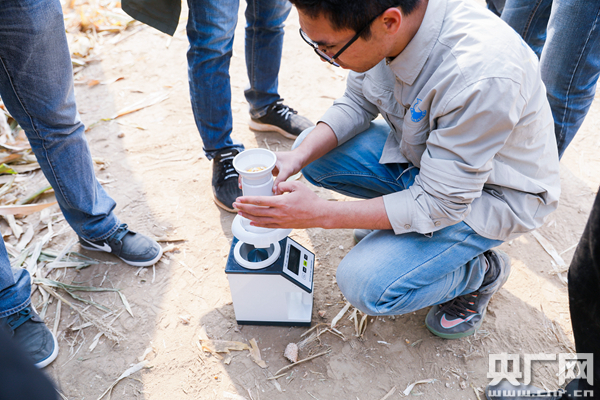 技術(shù)人員測量玉米籽粒中水分。(央廣網(wǎng)發(fā) 中化農(nóng)業(yè)提供)