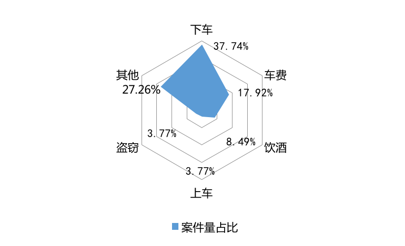從司乘糾紛起因分析,多為車(chē)費(fèi)、上下車(chē)地點(diǎn)等“一言不合”的小事,合計(jì)占比近六成。案件量靠前的各類糾紛起因及占比分別為:下車(chē)(37.74%),車(chē)費(fèi)(17.92%),飲酒或吸毒(8.49%),上車(chē)(3.77%),盜竊(3.77%),其他(27.26%)。