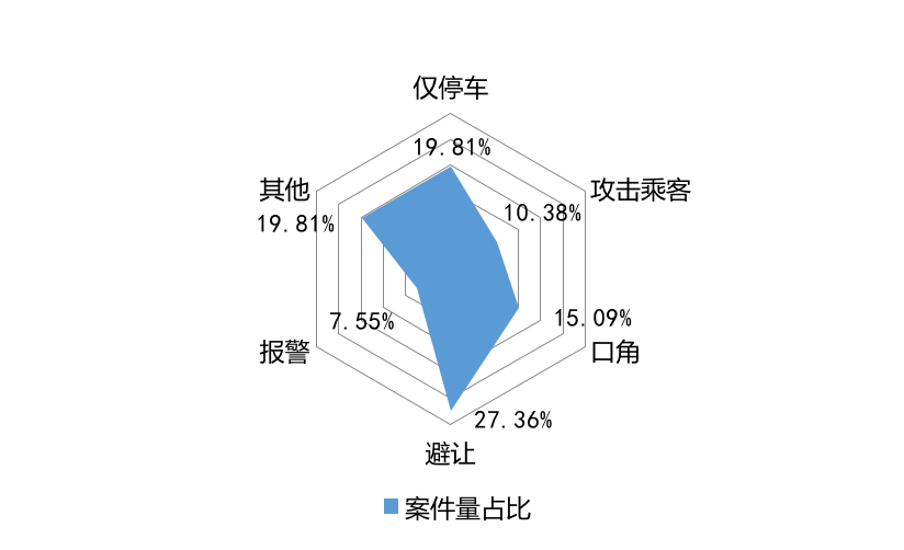 數(shù)據(jù)顯示,案件中乘客各類舉動(dòng)及占比分別為攻擊司機(jī)(54.72%),搶奪車(chē)輛操縱裝置(27.36%),持刀威脅司機(jī)(2.83%),盜竊司機(jī)財(cái)物(2.83%),與司機(jī)口角(1.89%),其他(10.37%)。