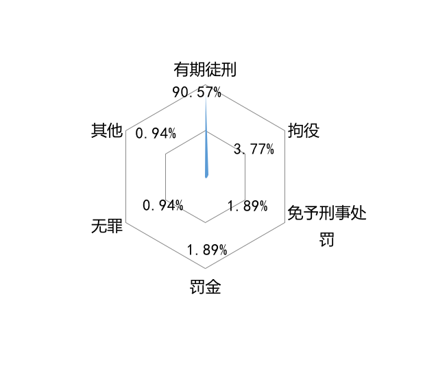 而從判決結(jié)果分析,90.57%的判決為有期徒刑,超八成被告人刑期在一年至五年。判決結(jié)果及占比分別為:有期徒刑(90.57%),拘役(3.77%),僅罰金(1.89%),免予刑事處罰(1.89%),無(wú)罪(0.94%),其他(0.94%)。有期徒刑刑期及占比分別為:一年以下(8.42%),一年至三年(38.95%),三年至五年(47.37%),五年至十年(4.21%),十年以上(1.05%)。