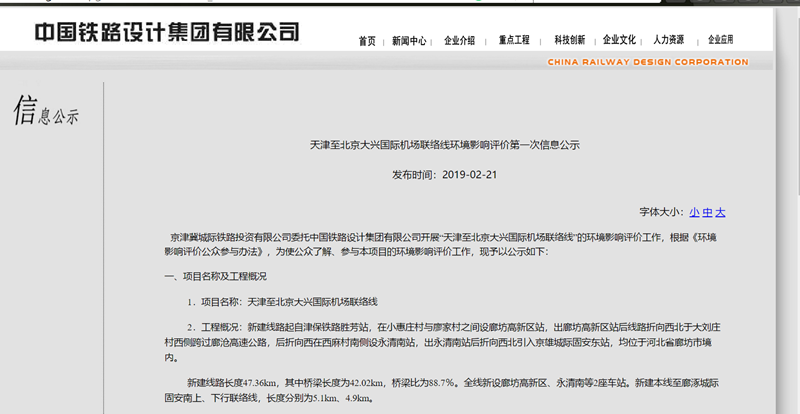 近日,天津至北京大興國際機場聯(lián)絡(luò)線環(huán)境影響評價首次信息公示(中國鐵路設(shè)計集團有限公司官網(wǎng)截圖)