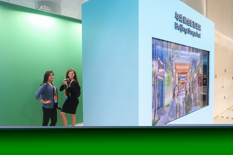 步入式合影互動區(qū)通過將參與者與背景景象的互動進行拍攝并合成,實現(xiàn)參與者與鳥巢、敦煌莫高窟等中國著名標志性建筑合影的效果,拍攝的圖片可以現(xiàn)場打印。
