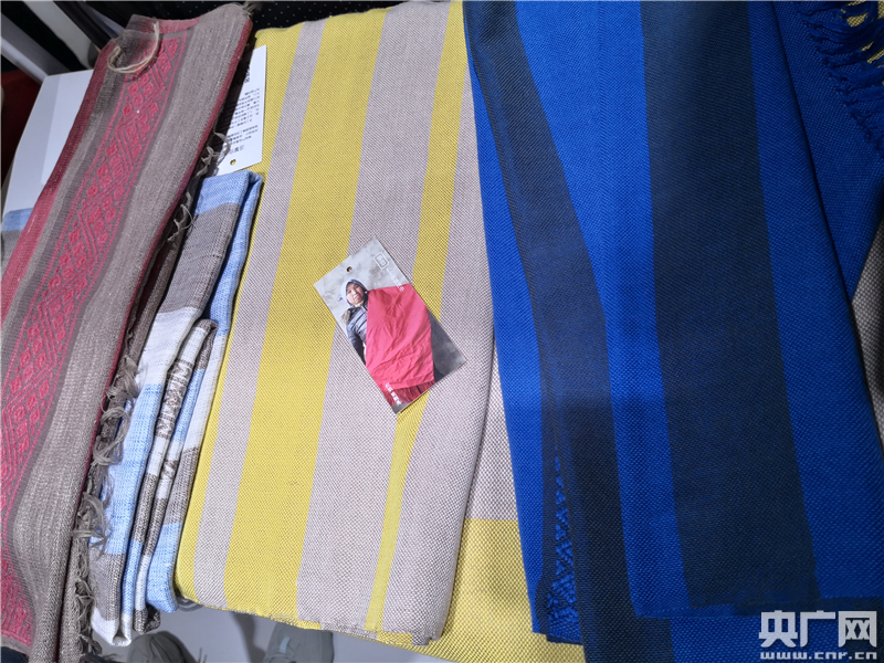 記者注意到,每一件充滿(mǎn)民族特色的織品中都夾著一張這樣的小卡片。(央廣網(wǎng)記者 劉一荻 攝)