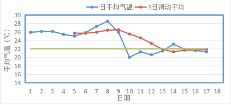 由上圖可見,2019年自9月13日起滑動平均氣溫序列開始小于22℃,并于9月17日達到連續(xù)5天小于22℃,其所對應(yīng)的氣溫序列中第一個小于22℃的日期為9月10日(20.0℃),而常年入秋日期為9月9日,因此無需進行二次判斷,據(jù)此可判斷2019年入秋日期為9月10日。