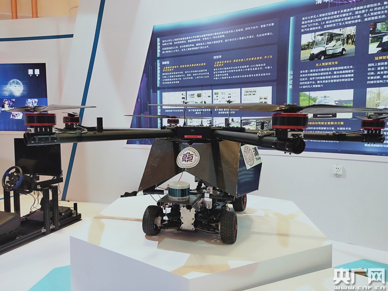 清華大學(xué)研發(fā)的陸空兩棲智能無人駕駛飛行車可應(yīng)用于物流、巡邏、救援等領(lǐng)域(央廣網(wǎng)記者王啟慧 攝)
