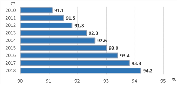 2010—2018年九年義務(wù)教育鞏固率情況(央廣網(wǎng)發(fā) 國(guó)家統(tǒng)計(jì)局供圖)
