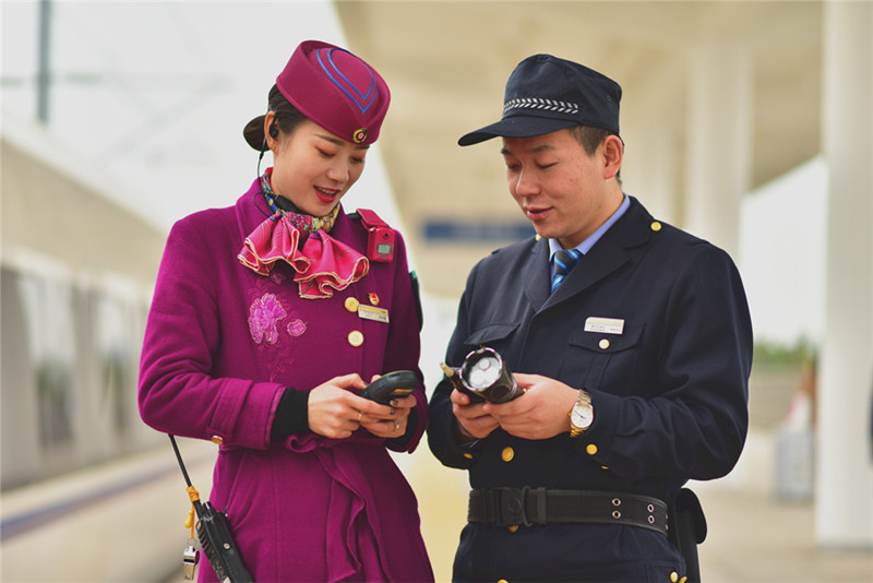 萬州北站的站臺上薛稀吉日正與列車長交流值乘情況(央廣網(wǎng)發(fā) 陳亞 攝)