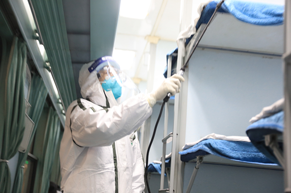 北京鐵路疾控中心小分隊正在對車廂進行消毒(央廣網(wǎng)發(fā) 北京鐵路供圖)