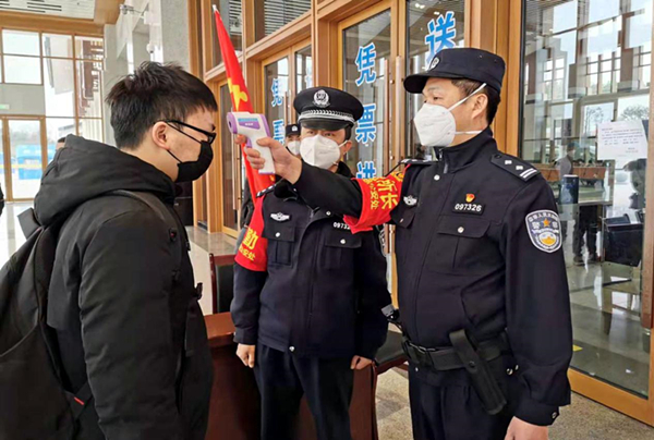 湖南懷化鐵路公安處民警為旅客測(cè)量體溫(公安部鐵路公安局供圖)