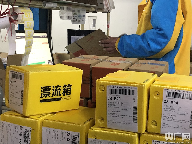 11月11日,蘇寧通州物流基地,這種料箱可代替紙箱裝載消費(fèi)者購(gòu)買(mǎi)的商品,滿足快遞綠色化的要求(央廣網(wǎng)記者 黃一博 攝)