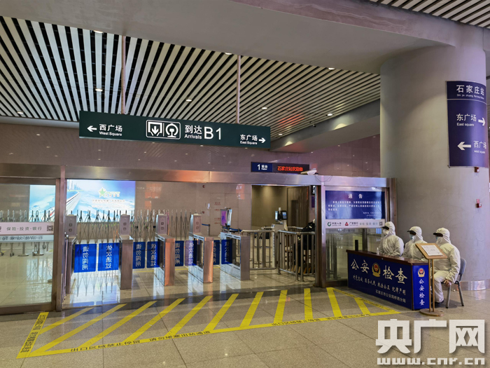 石家莊市火車(chē)站出站口處安排了防疫人員對(duì)進(jìn)石旅客防疫檢測(cè)
