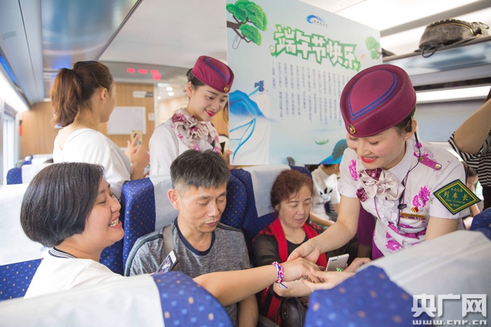 6月13日,在成都東開(kāi)往上海虹橋的D354次動(dòng)車(chē)組列車(chē)上,“動(dòng)妹”正在為旅客系上象征吉祥的五彩繩(央廣網(wǎng)發(fā) 龔萱 攝)