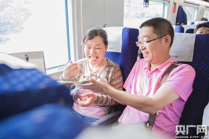 6月13日,在成都東開(kāi)往上海虹橋的D354次動(dòng)車(chē)組列車(chē)上,兩名旅客正在品嘗粽子(央廣網(wǎng)發(fā) 龔萱 攝)
