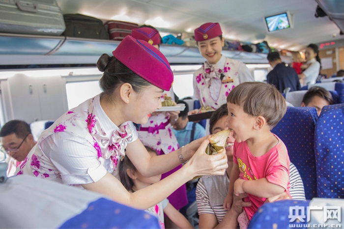 6月13日,在成都東開(kāi)往上海虹橋的D354次動(dòng)車(chē)組列車(chē)上,“動(dòng)妹”正在喂小朋友吃粽子(央廣網(wǎng)發(fā) 龔萱 攝)