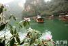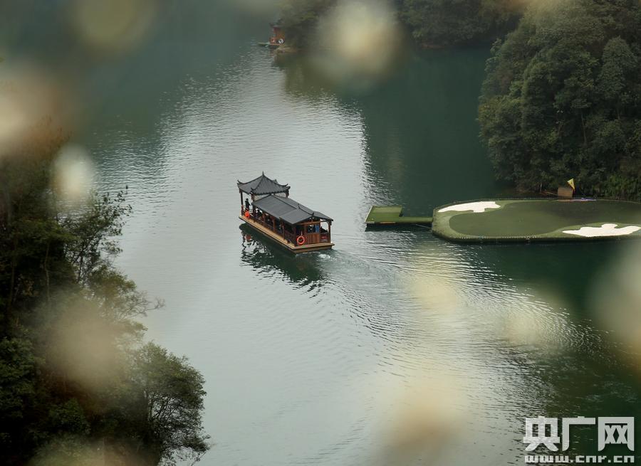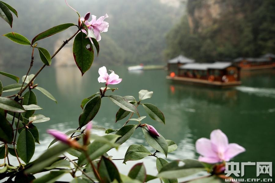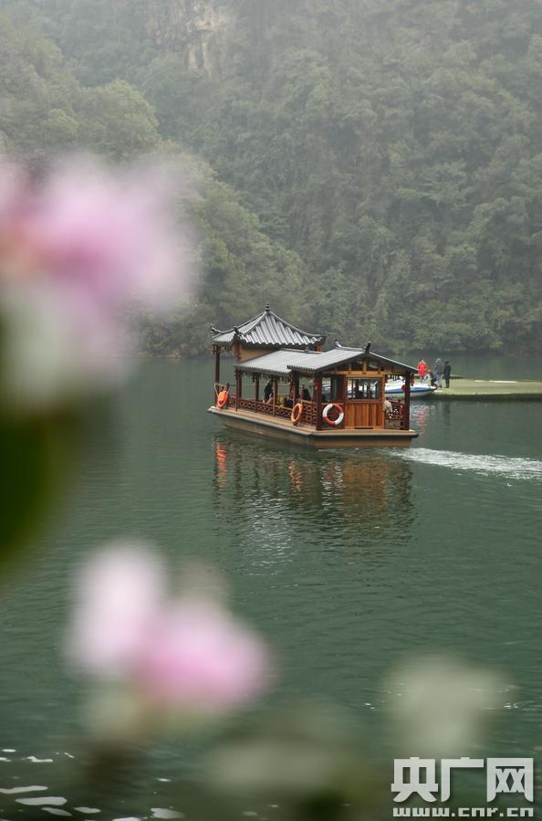 。┝⒋汉,湖南張家界寶峰湖風(fēng)景區(qū)櫻花、映山紅次第開放,爭奇斗艷,與碧綠的湖水交相輝映,船行其間宛如一幅春色畫卷