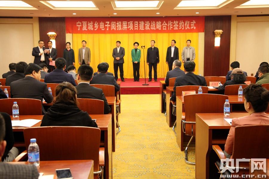 簽約儀式現(xiàn)場(chǎng)(央廣網(wǎng)記者許新霞 攝) 央廣網(wǎng)銀川4月25日消息(記者許新霞)寧夏城鄉(xiāng)電子閱報(bào)屏項(xiàng)目今天下午在銀川舉行戰(zhàn)略合作簽約儀式。項(xiàng)目總投資6億元,計(jì)劃建設(shè)10000個(gè)點(diǎn),分兩期建成。 寧夏城鄉(xiāng)電子閱報(bào)屏項(xiàng)目是由中國新聞文化促進(jìn)會(huì)組織發(fā)起、社會(huì)力量參與的全國性公共文化設(shè)施建設(shè)工程,旨在深入貫徹落實(shí)《中華人民共和國公共文化服務(wù)保障法》的實(shí)施及中辦、國辦《關(guān)于加快構(gòu)建現(xiàn)代公共文化服務(wù)體系的意見》文件精神,推動(dòng)全民閱讀和公共文化服務(wù)網(wǎng)絡(luò)建設(shè)的健康發(fā)展。 -