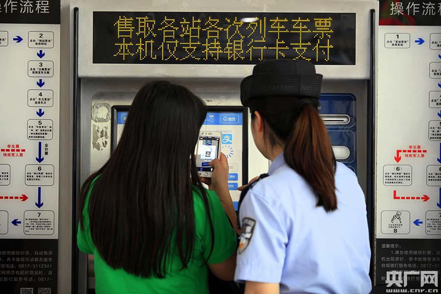 民警在南充火車站向旅客講解自助購票時銀行卡密碼的安全輸入方法 -