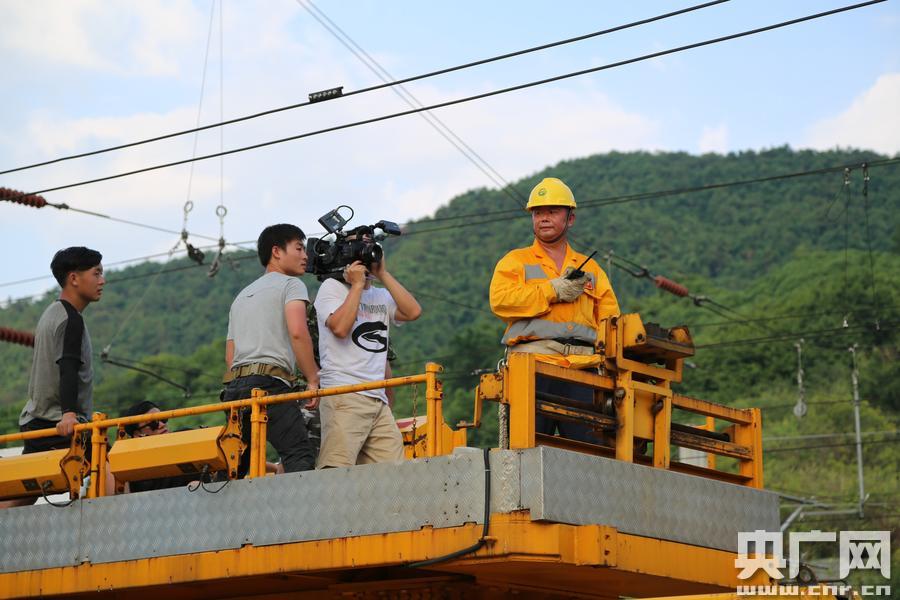 勞模當(dāng)上“男主角”(央廣網(wǎng)發(fā) 楊傳榮攝) 為反映成鐵工匠精神,宣傳路局勞模先進事跡,由路局工會牽頭,在全局拍攝7名先進人物的微電影專題片《匠心》近日正在拍攝中。8月27日這天,重慶天氣高達(dá)38攝氏度。當(dāng)日上午,拍攝組成員先到白市驛接觸網(wǎng)工區(qū)拍攝,直到下午14時20分才趕到北碚生產(chǎn)基地吃午飯。之后又繼續(xù)拍攝。 -