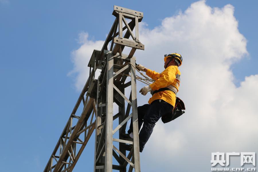 勞模當(dāng)上“男主角”(央廣網(wǎng)發(fā) 楊傳榮攝) 在北碚生產(chǎn)基地,為了拍攝一個肖成功攀登支柱檢修的鏡頭,導(dǎo)演反復(fù)讓他攀登了3次。為了拍攝夜間作業(yè)的鏡頭,當(dāng)天拍攝到晚上22時才結(jié)束。當(dāng)日,肖成功從早到晚當(dāng)了一回主角,他的臉早被太陽曬紅了。被“折騰”一天的他說,當(dāng)一回“男主角”還真不容易。