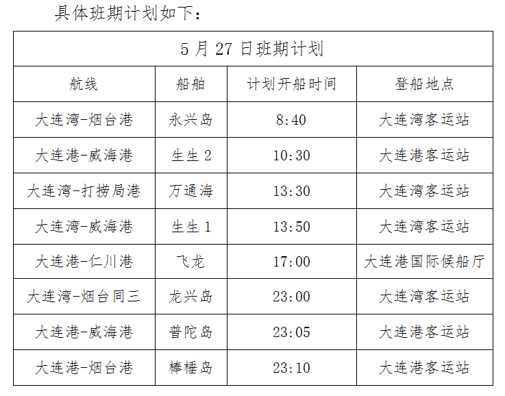 原計劃8點20分由大連港開往長海縣的獐子島輪和原計劃9點30分由大連港開往煙臺的萬榮海輪停航;原計劃21點35分由大連灣港開往煙臺的龍興島輪延至23點開航,原計劃21點30分由大連港開往威海的普陀島輪延至23點05分開航,原計劃22點30分由大連港開往煙臺的棒棰島輪延至23點10分開航。其它航班正常,提醒旅客注意調(diào)整出行安排。