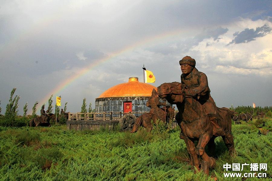 八月的內蒙古草原,風云變幻,暴雨說話間就呼嘯而至,但你被雨淋濕的衣服還未干,陽光就已經驅散了烏云,絢麗的彩虹掛在天邊,給地上飛人們送來微笑。前不久在成吉思汗陵,就遇到了這樣的一幕,只是不僅有彩虹,而且是雙彩虹。(央廣網記者 崔彤 攝)
